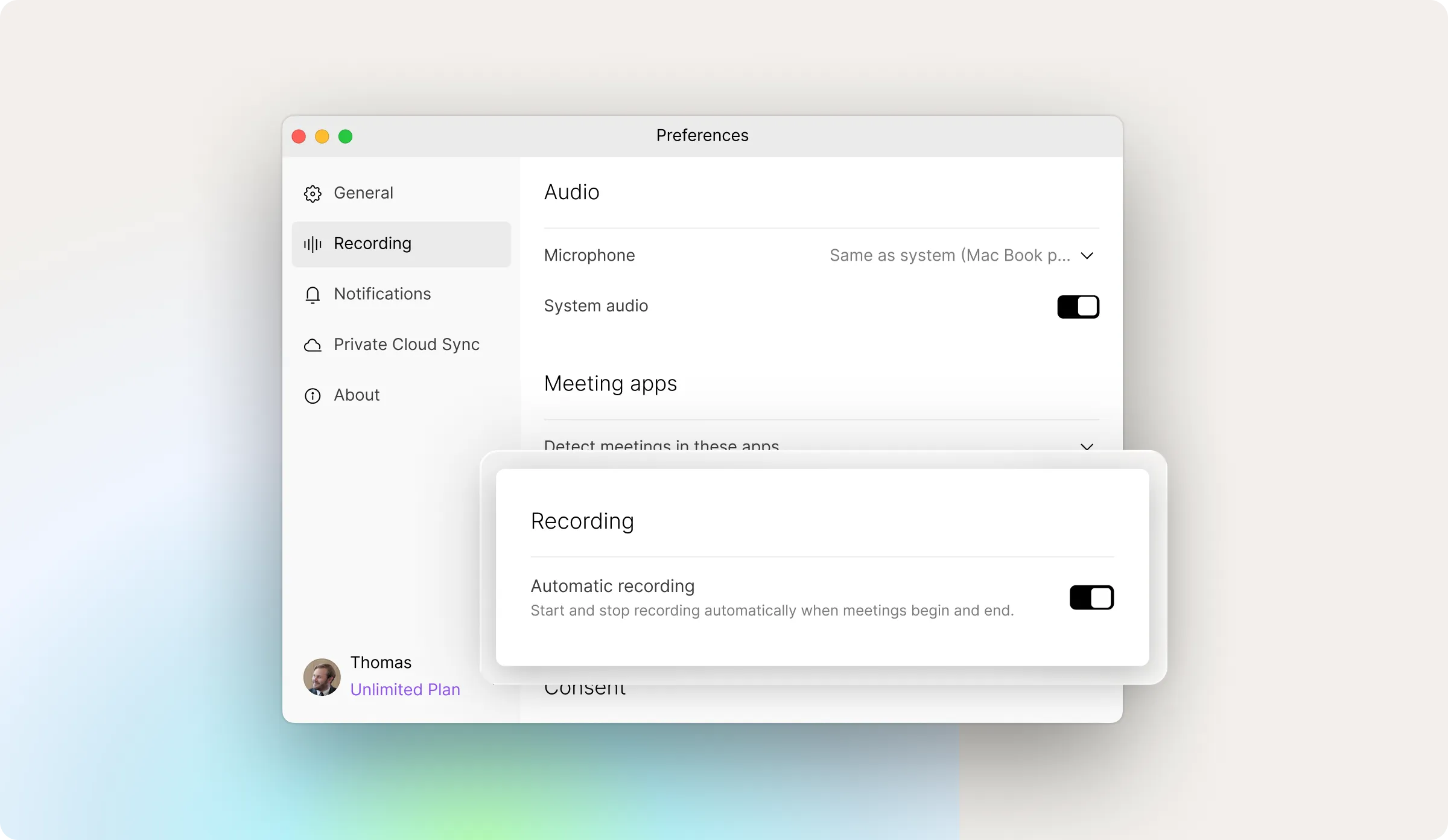 Control exactly when Plaud Desktop records. Set it on automatic recording, get a prompt when meetings start, or start recording manually. This gives you flexiblity and control that fits your workflow and protects your privacy.