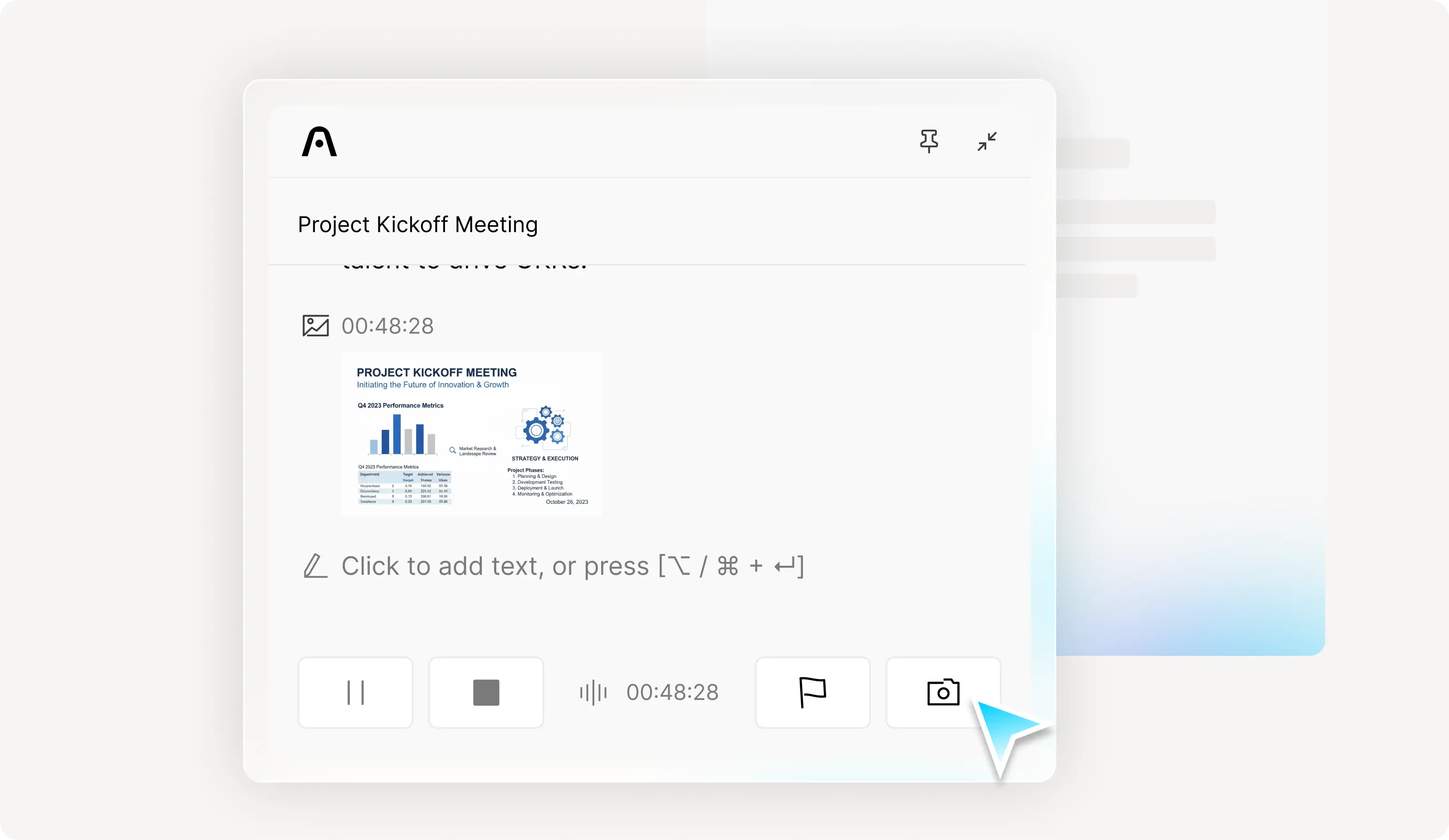 Capture screenshots instantly. Plaud Desktop feeds each image into the AI so it understands visual details like slides and diagrams, helping it produce a more complete summary.