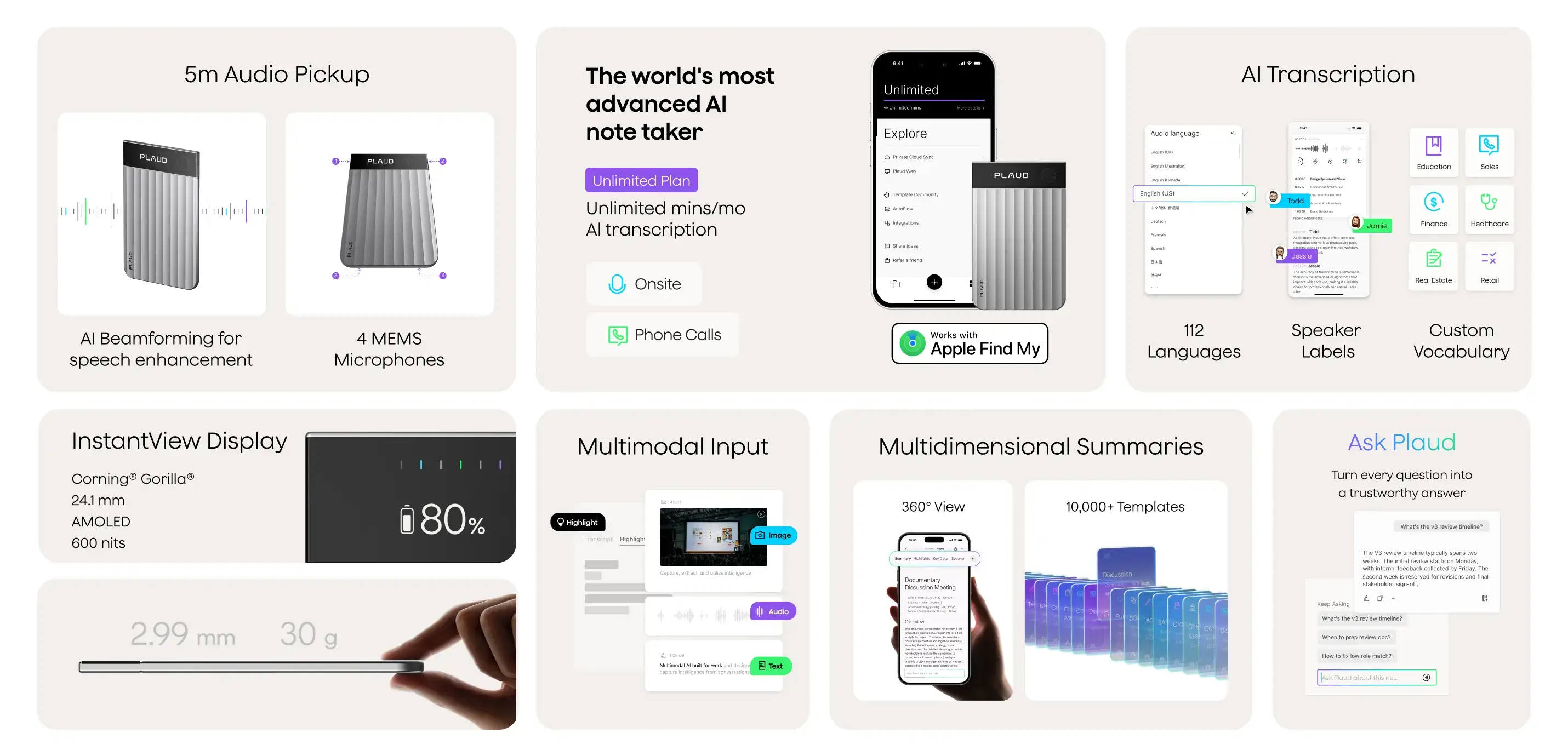 With AI beamforming, Plaud Note Pro captures crystal-clear voices from up to 5 metres, so every word is preserved in detail.